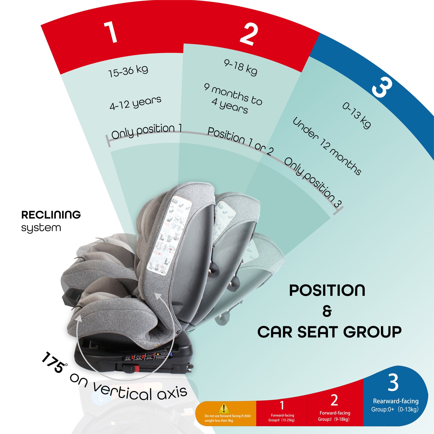- راحة الاستلقاء: يتميز بـ 4 أوضاع استلقاء (3 مواجهة للأمام و 1 مواجهة للخلف) لضمان استرخاء طفلك سواء كان جالسًا في وضع مستقيم أو مستلقيًا بشكل مسطح.