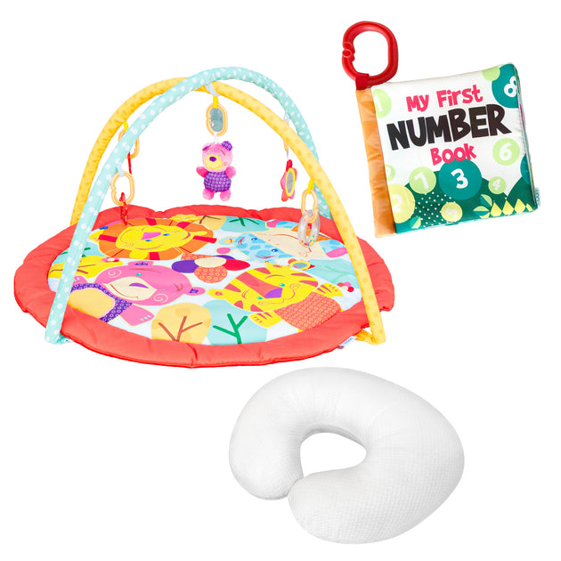 سجادة لعب MOON Perky (حيوانات) / وسادة الرضاعة العضوية MOON (أبيض، قماش عضوي) / كتاب MOON القماشي الناعم (أرقام)