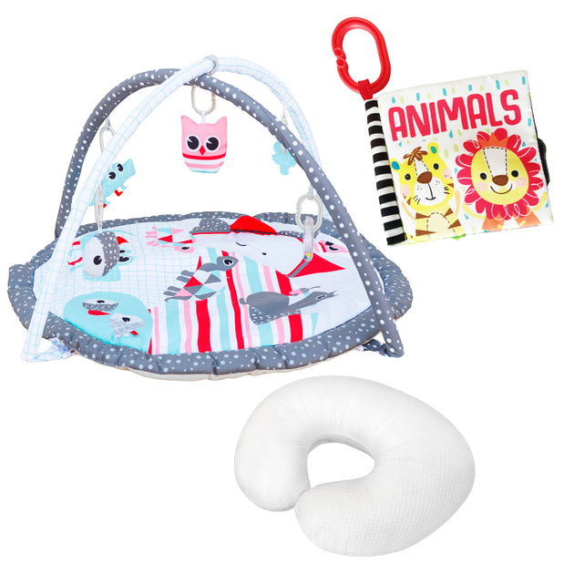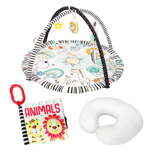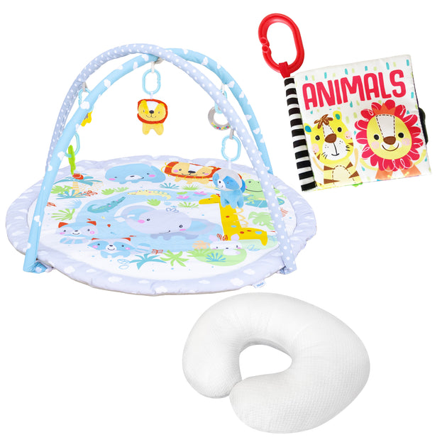 سجادة لعب MOON Perky (يوم جيد) / وسادة الرضاعة العضوية MOON (أبيض، قماش عضوي) / كتاب MOON القماشي الناعم (حيوانات)