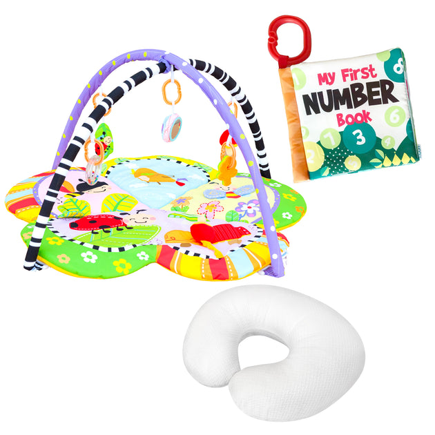 سجادة لعب MOON Perky (زهرة) / وسادة الرضاعة العضوية MOON (أبيض، قماش عضوي) / كتاب MOON القماشي الناعم (أرقام)