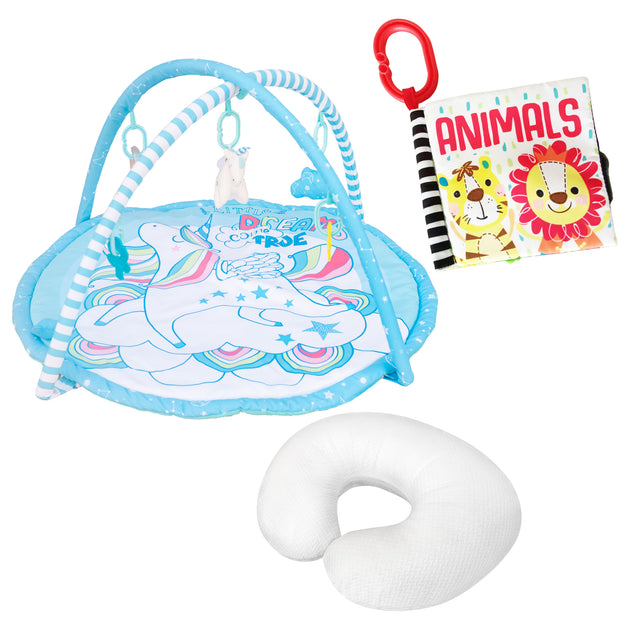 سجادة لعب مون بيركي - يونيكورن / وسادة الرضاعة العضوية مون (أبيض، قماش عضوي) / كتاب مون القماشي الناعم - حيوانات