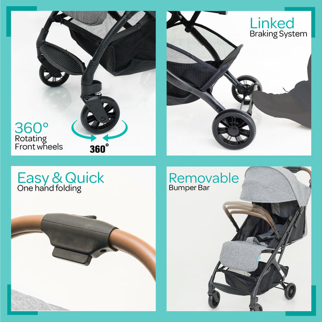 عربة أطفال مون ريتشي المتطورة، مقبض دوار 360 درجة - رمادي