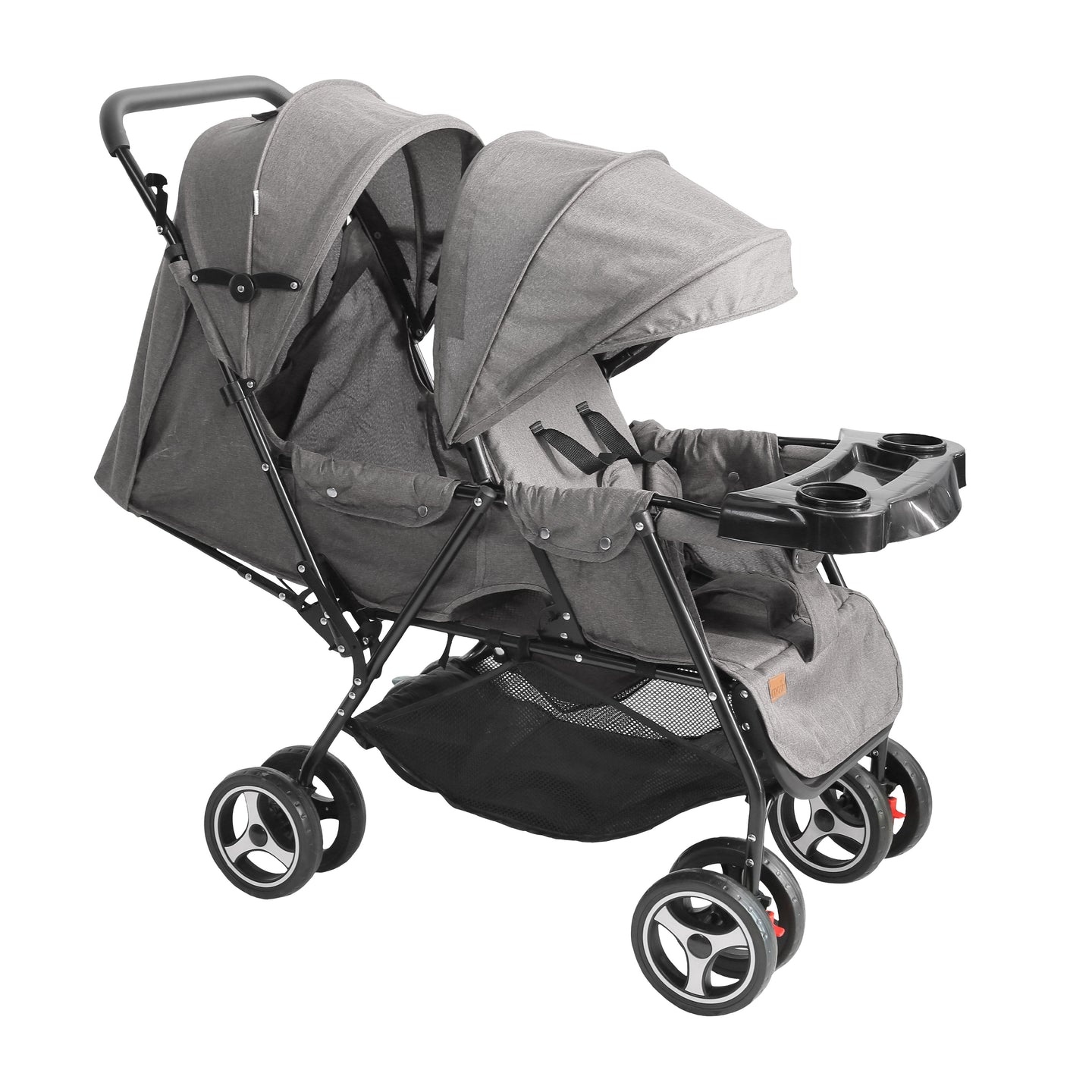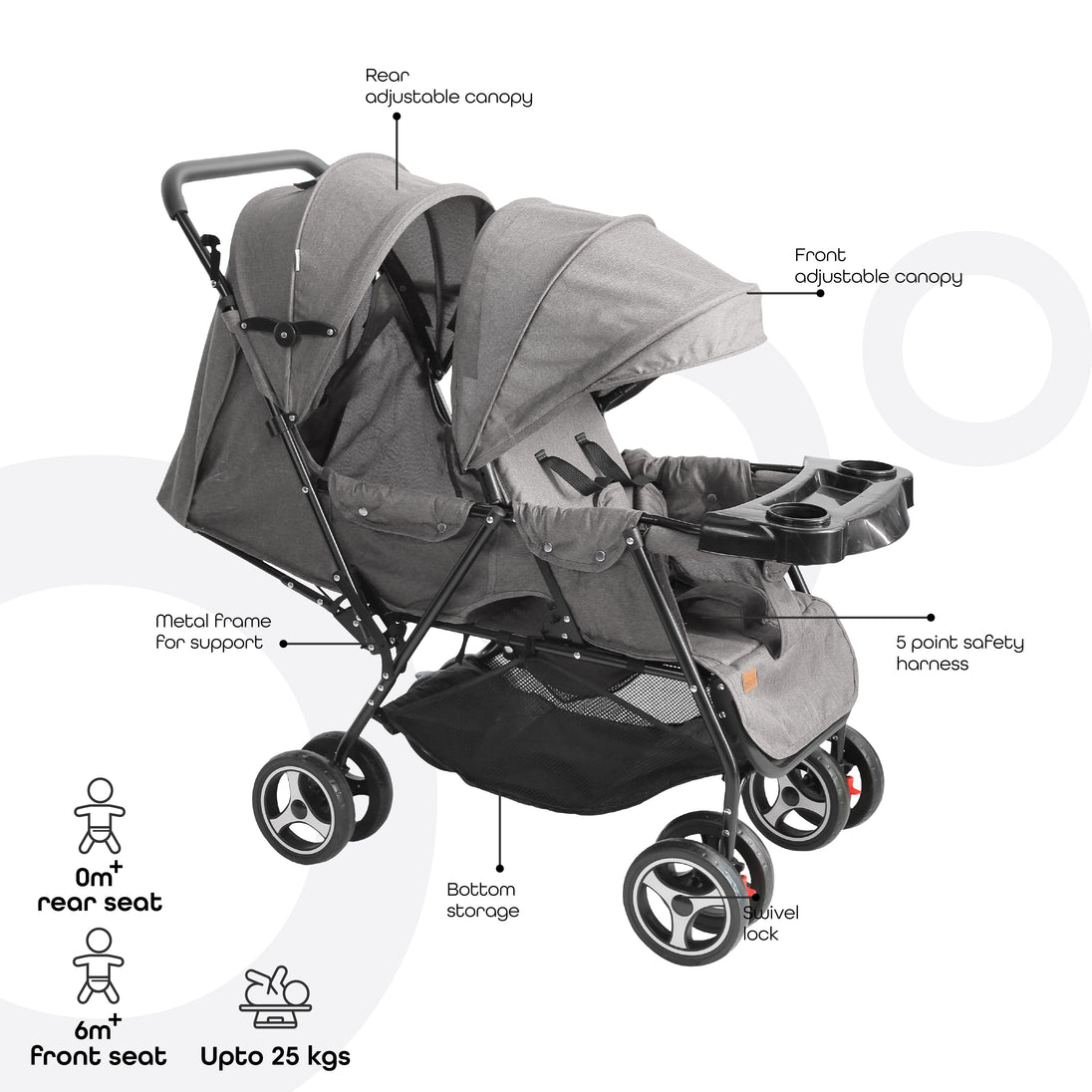 • سعة الوزن: يدعم كل مقعد ما يصل إلى 15 كجم، مع سعة إضافية تبلغ 2 كجم في سلة التخزين، مما يسمح لك بحمل ضروريات أطفالك بسهولة.