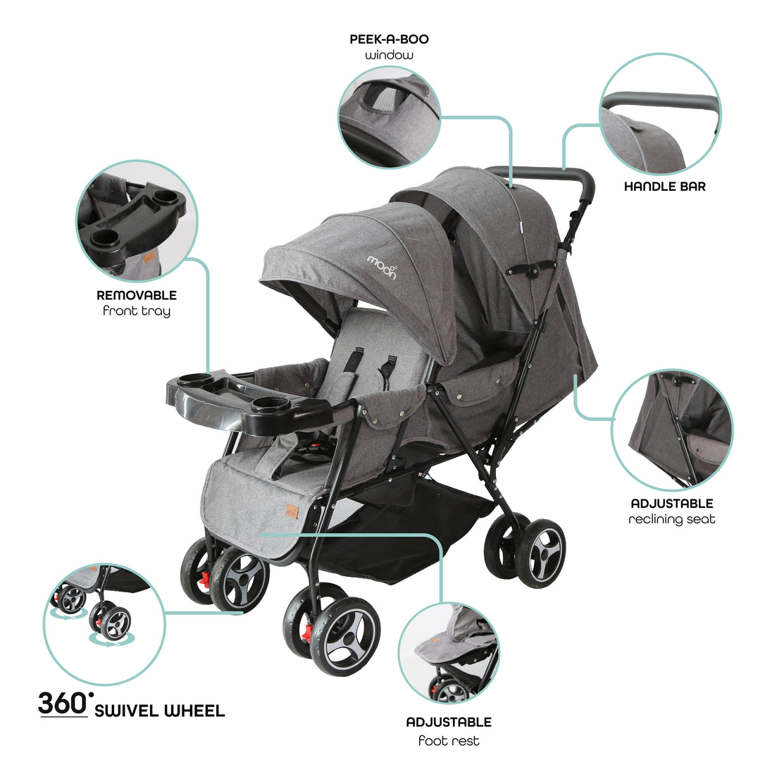 تجمع عربة السفر التوأمية القابلة للطي بسهولة من Moon Brand™ Magnum Tandem بين الوظيفة والأناقة، مما يجعلها خيارًا ممتازًا للآباء الذين يبحثون عن حل موثوق ومريح لنقل طفلين.