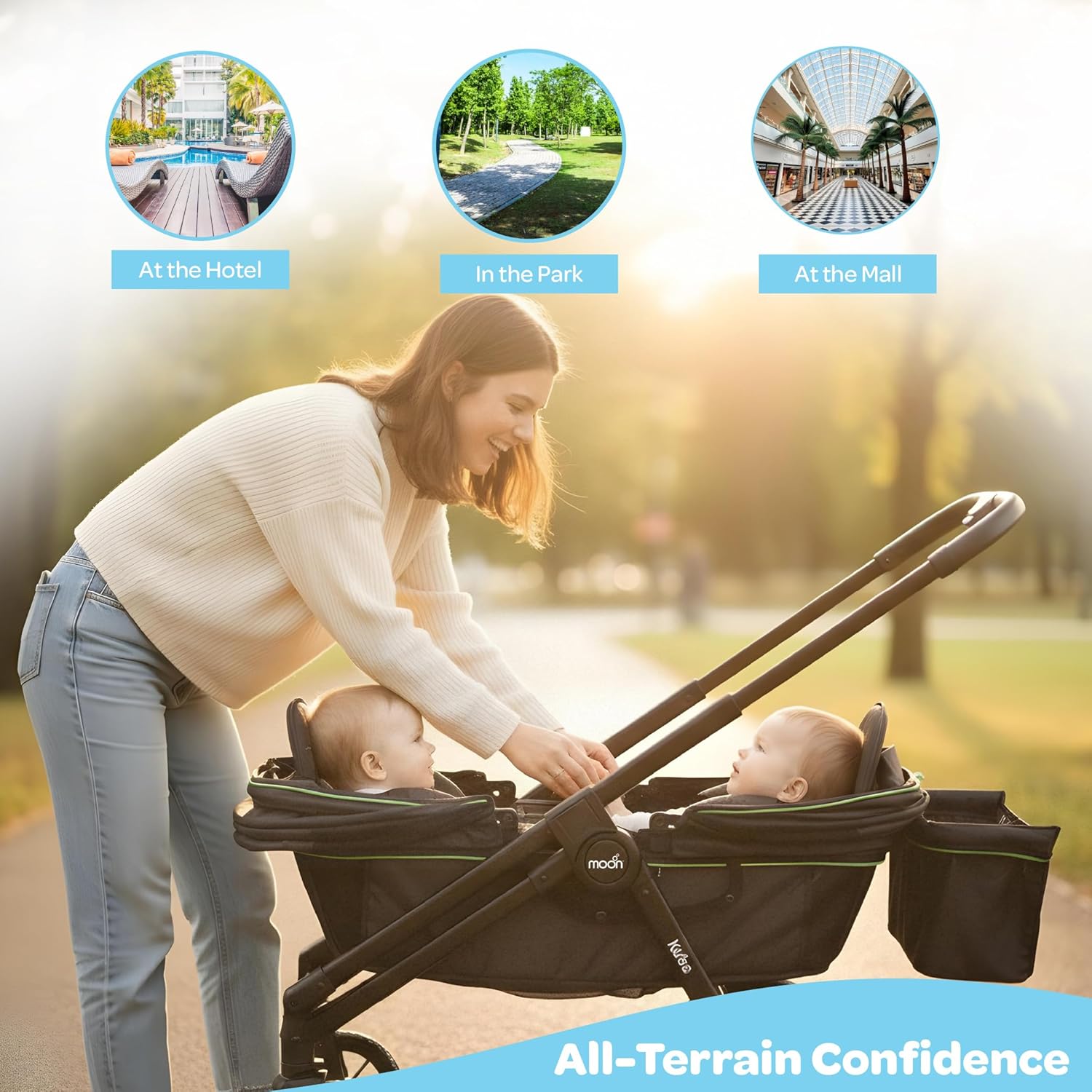 MOON Kube Wagon Stroller -Ultimate Ride for Little Explorers Built for kids. Engineered for parents. Ready for anywhere. Say hello to the all-in-one wagon stroller that adapts to your life, your kids, and every adventure in between. Whether you're pushing through crowded city streets or pulling across a grassy park, this premium wagon is for multitasking parent which is a must have in their gear collection. Designed with convenience, safety, and comfort in mind, this stroller-wagon hybrid is packed with thoughtful details—from a cozy bassinet insert for infants to seats that hold up to 24kgs each, making it perfect for children aged 6 months to 4 years. With its smart push-to-pull mode, compact fold, and STOW & Go storage, parenting just got a whole lot easier—and way cooler. Why This Wagon is a Game-Changer for Parents: • Push or Pull Mode: • All-Terrain Confidence • Sun-Safe Comfort • Room to Grow • Storage, Sorted • Compact Fold Perfect For: • Outdoor-Parks • Travel, mall days, or just everyday errands • Ages 6 months to 4 years Make room in your life—and your trunk—for the only stroller you’ll ever need. Grab yours today and experience the next