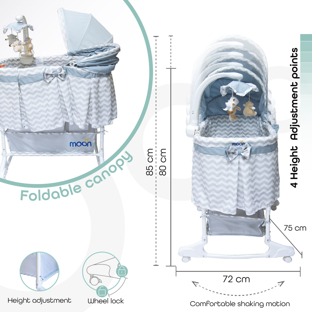 The Moon Soffy cradle is a 4 in 1 convertible bassinet that can be easily attached to the bed and keep the baby close to its parents. It can fit perfectly to the bed with its drop down side and 5 height adjustments. You can use it as a bassinet, a cradle, a changer or a by-the-bed-sleeper.
