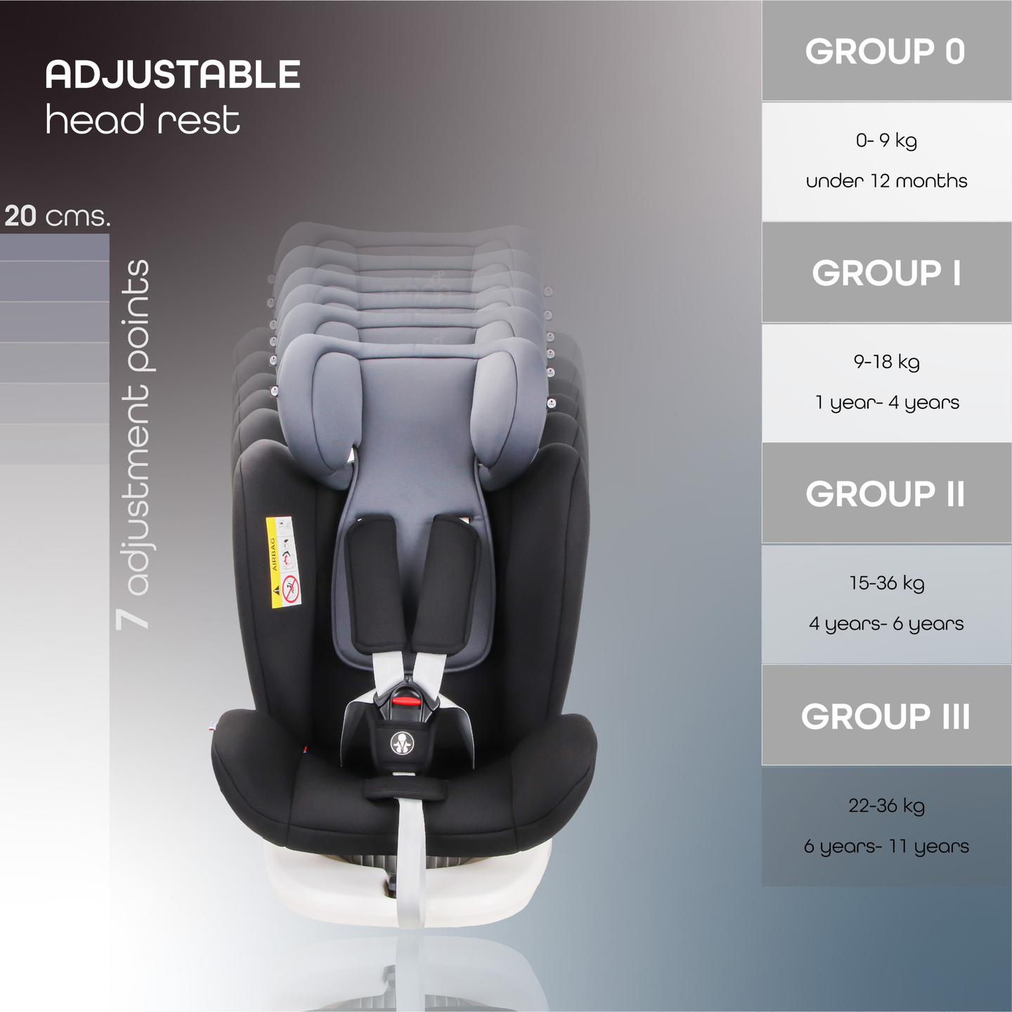 - Growth-Adjustable: Designed for Group 0+123, this car seat accommodates children from 0–36 kg, featuring a 7-position adjustable headrest for 12 years of use.