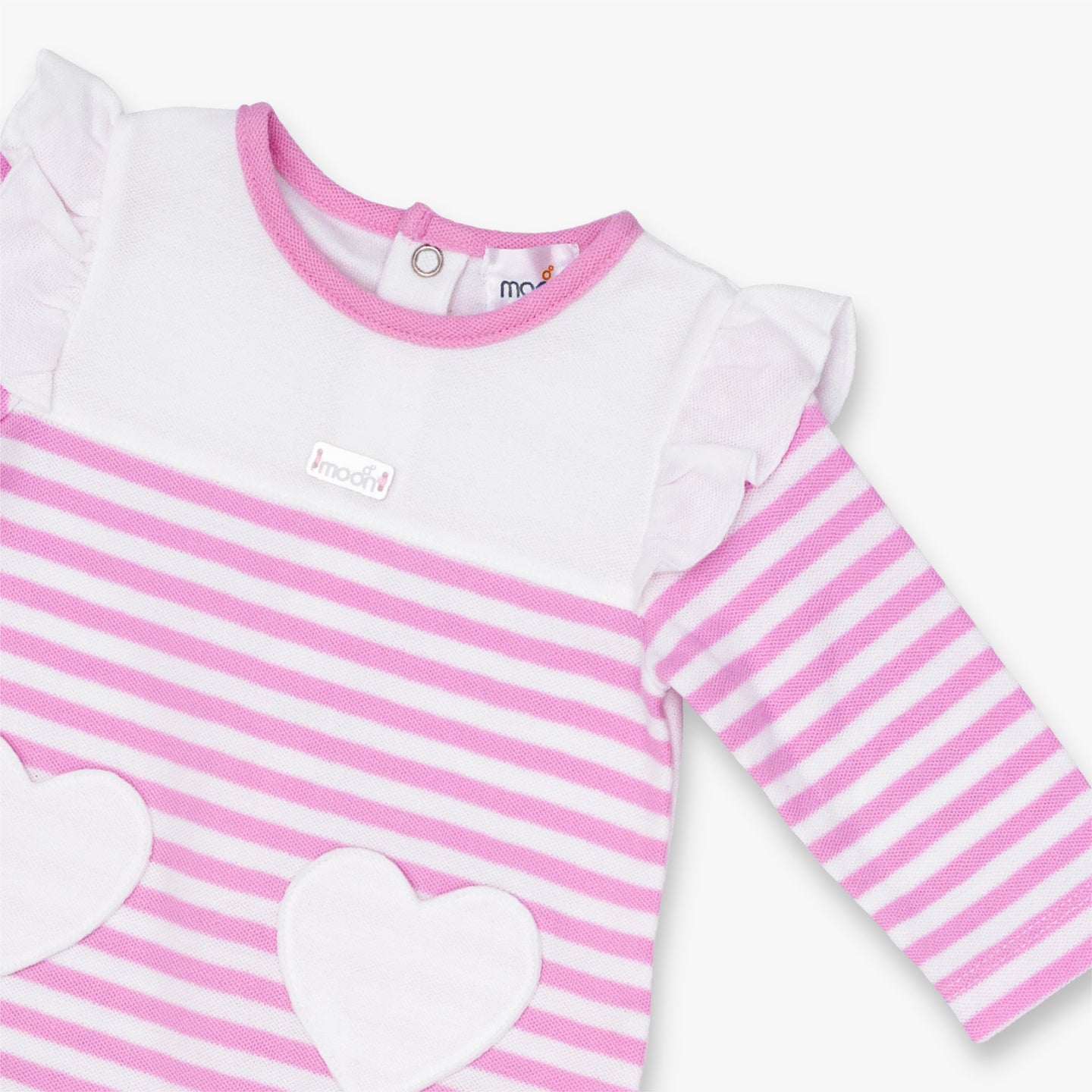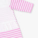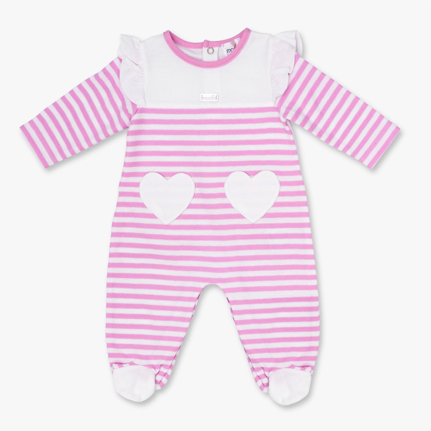 • Pink Stripes: A comfy baby girl sleepsuit by MOON has a Pink Stripes motif, featuring crew neck binding with back closure press studs, full sleeves, two mini heart shaped pockets and Snap Fastener Between Legs that extend to the ankles with closed feet