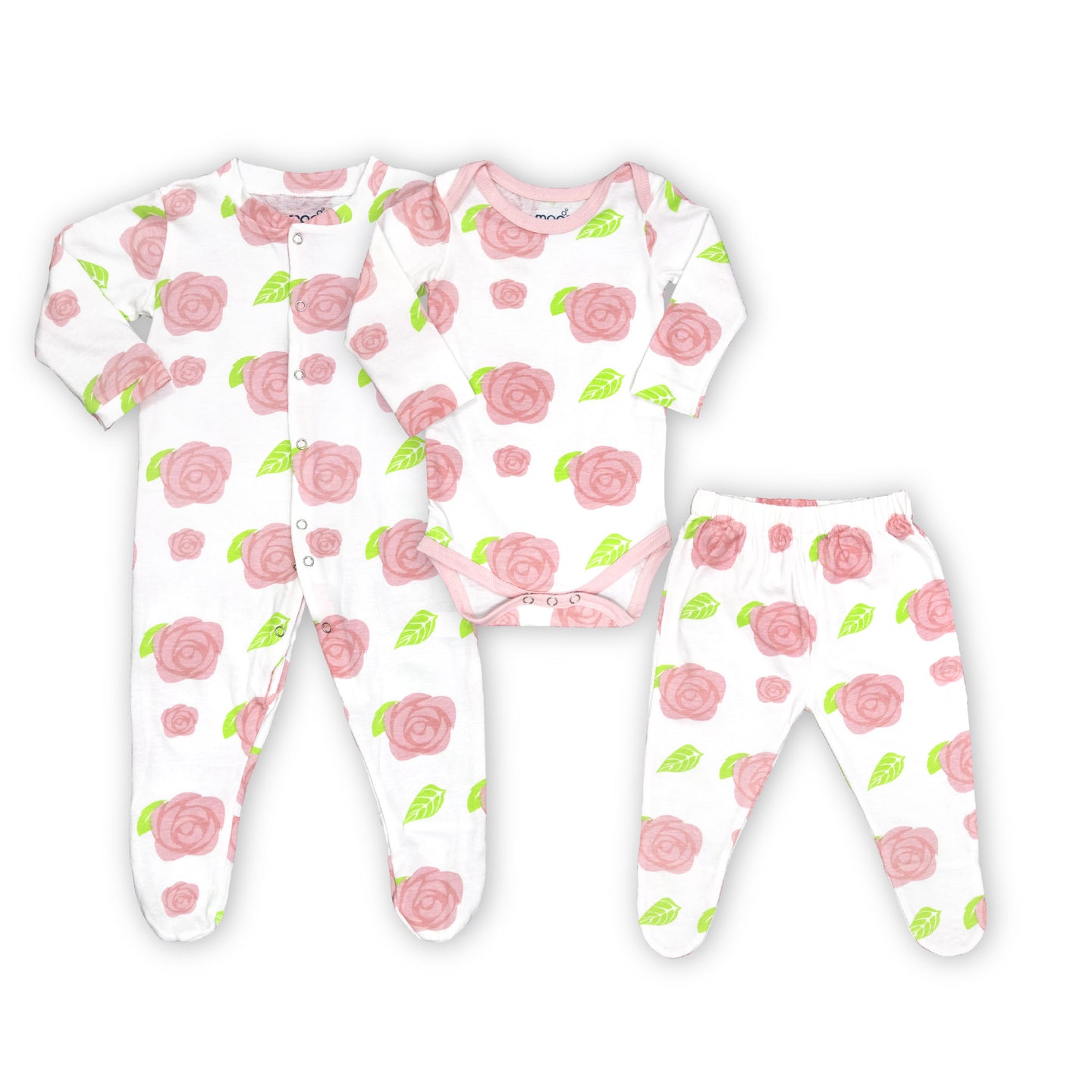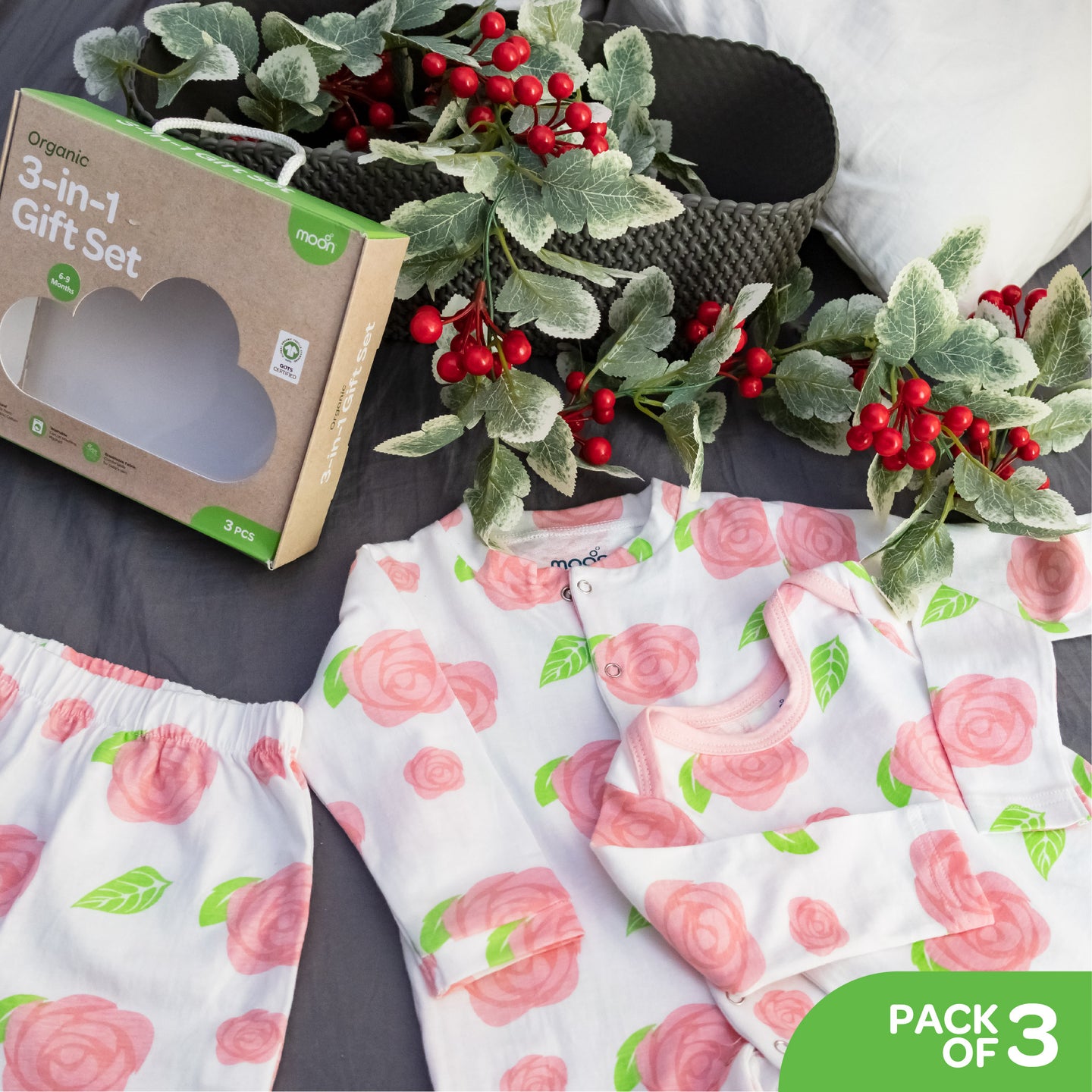 - Organic Baby 3 in 1 Gift Set: This adorable gift set includes a matching romper, body suit, and jogger. Available in cute prints and adorable patterns..