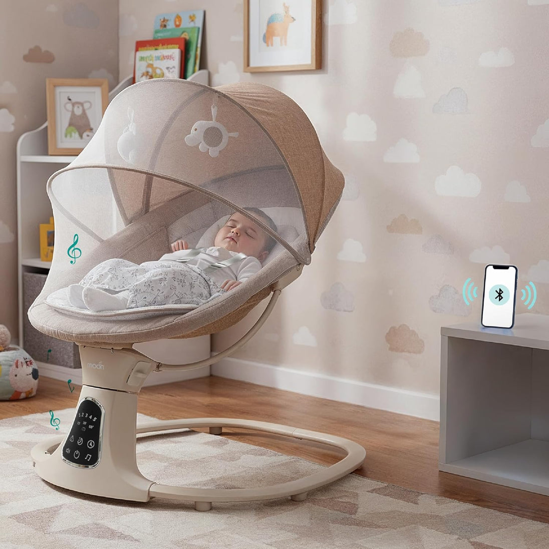 Sleep Smarter. Soothe Easier. MOON KOZE Electric Baby Swing – Where Comfort Meets Convenience Say goodbye to restless naps and endless rocking. MOON Baby Swing is every parent’s must-have for a smoother, calmer routine. Designed for babies from 0–6 months (up to 9kg), this swing mimics a parent's natural sway to lull your little one into peaceful sleep — all while giving your arms a much-needed break. Why Every Parent Needs This: Hands-Free Soothing, Anytime – Whether you're working, cooking, or just resting, the remote control + motion sensor takes over, gently rocking your baby when they need it most. Built-In Music System – From soothing melodies and nature sounds to your own playlist via Bluetooth or USB, sound is therapy — made easy. Custom Speeds & Timers – Adjust swing intensity and timer settings to suit your baby’s mood — because every nap is different. Designed for Real-Life Parenting – Comes with a mosquito net, removable toy bar, breathable mesh cushion, and washable pillow head for comfort and cleanliness. Uncompromised Safety – With a 5-point harness and sturdy frame, your baby is secure while you get things done. Trusted by Parents. Built by MOON. This isn’t just a swing. It’s your baby’s favourite nap spot. And your best parenting hack. MOON is known for thoughtful baby essentials that combine smart features, comfort, and style — and this swing is no exception. Let them sleep. You relax.