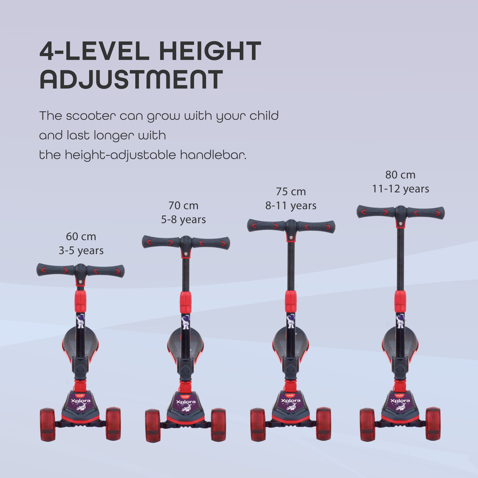 • Durability- High quality materials have been used in the production of the scooter to allow it to hold upto 50 kgs. Maximum height is 127 cm, which means your child can use the Xplora for a long time.